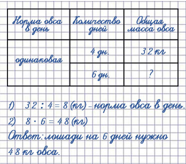 4. На 4 дня лошади нужно 32 кг овса. (Ежедневная норма выдачи овса одна и та же.) Сколько килограммов овса нужно лошади на 6 дней, если норма выдачи в день не изменится?