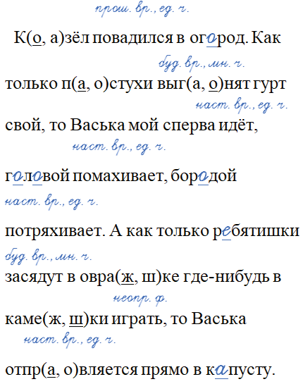К(о, а)зёл повадился в ог..род. Как только п(а, о)стухи выг(а, о)нят гурт свой, то Васька мой сперва идёт, г..л..вой помахивает, бор..дой потряхивает. А как только р..бятишки засядут в овра(ж, ш)ке где-нибудь в каме(ж, ш)ки играть, то Васька отпр(а, о)вляется прямо в к..пусту.