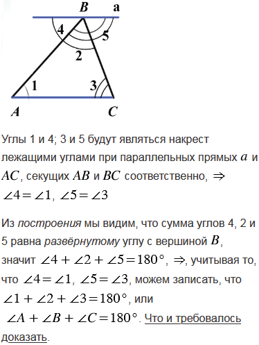 Сформулируйте и докажите теорему о сумме углов треугольника.