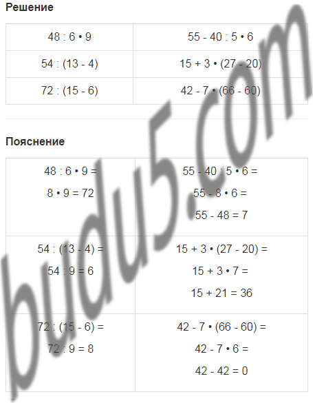 | 54 : (13 - 4) | 15 + 3 • (27 - 20) |