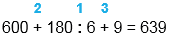1) 180 : 6 = 30 2) 600 + 30 = 630 3) 630 + 9 = 639 |