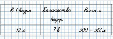 402. Ребята заполнили водой два больших аквариума: в один они влили 300 л воды, а в другой - 312 л. Сколько вёдер воды им пришлось для этого принести? Дополни задачу недостающими данными и реши её.
