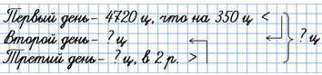 3. На элеватор привезли в первый день 4 720 ц пшеницы, это на 350 ц меньше, чем во второй день; в третий день привезли в 2 раза больше, чем во второй день. Поставь вопрос и реши задачу.