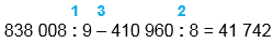 838 008 : 9 - 410 960 : 8 = 41 742