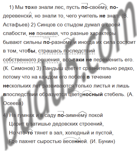 1) Мы (то) же знали лес, пусть (по) своему, (по) деревенски, но знали то, чего учитель (не) знал. (В. Астафьев) 2) Синцов со стыдом думал о своей слабости, (не) понимая, что разные характеры бывают сильны (по) разному и иногда их сила состоит в том, что (бы), страшась последствий собственного решения, всё (таки) (не) переменить его. (К. Симонов) 3) Ландыш цветёт сравнительно редко, потому что на каждом его побеге (в) течение (не) скольких лет развиваются только листья и лишь (в) последствии образуется цвето (носный) стебель. (А. Осеева)