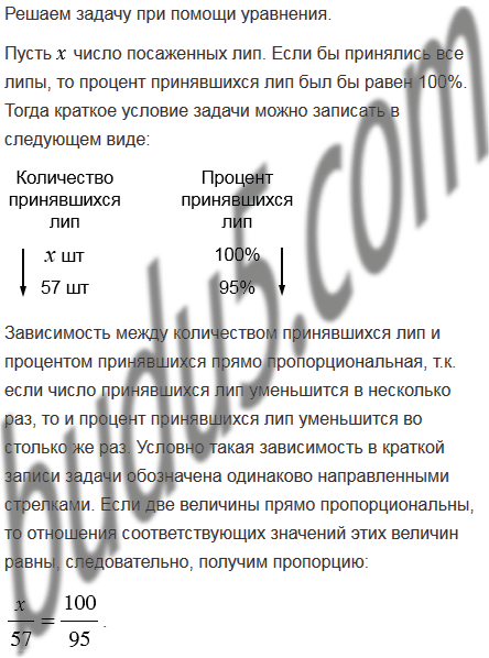 Весной при проведении работ по озеленению города на улице посадили липы. Принялось 95% всех посаженных лип. Сколько посадили лип, если принялось 57 лип?