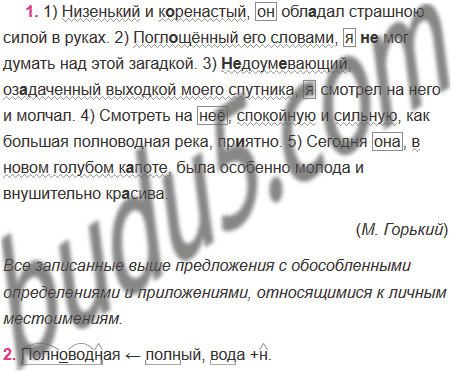 1) Низенький и к..ренастый он обл..дал страшною силой в руках. 2) Погл..щённый его словами я (не)мог думать над этой загадкой. 3) (Не)доум..вающий, оз..даченный выходкой моего спутника я смотрел на него и молчал. 4) Смотреть на неё спокойную и сильную, как большая полноводная река, пр..ятно. 5) Сегодня она в новом голубом к..поте была особенно молода и внушительно кр..сива.