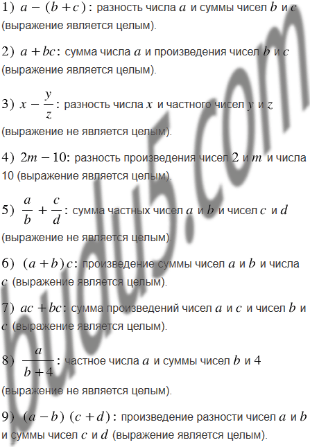Используя термины "сумма", "разность", "произведение", "частное", прочитайте алгебраические выражения и укажите, какие из них являются целыми: