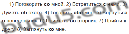 1) Поговорить (с, со) мной. 2) Встретиться (с, со) нами. 3) Думать (об, обо) охоте. 4) Говорить (об, обо) мне. 5) Вернуться (в, во) понедельник. 6) Приехать (в, во) вторник. 7) Прийти (к, ко) другу. 8) Заглянуть (к, ко) мне.