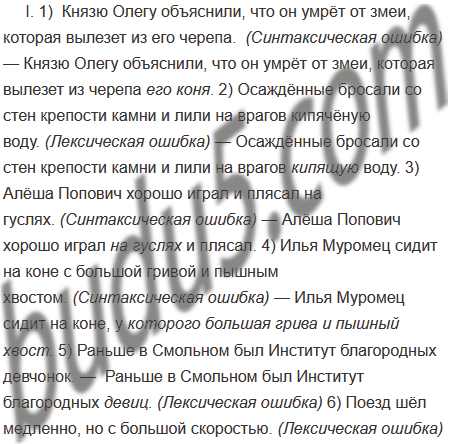 I. 1) Князю Олегу объяснили, что он умрёт от змеи, которая вылезет из его черепа. 2) Осаждённые бросали со стен крепости камни и лили на врагов кипячёную воду. 3) Алёша Попович хорошо играл и плясал на гуслях. 4) Илья Муромец сидит на коне с большой гривой и пышным хвостом. 5) Раньше в Смольном был Институт благородных девчонок. 6) Поезд шёл медленно, но с большой скоростью. 7) На крыльцо вышла девочка с собакой в платке и валенках. 8) Над городом стройной толпой летели мурлыкающие журавли. (Л. Каминский)