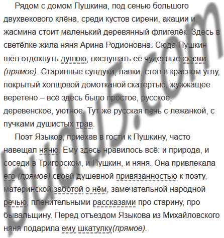 Рядом с домом Пушкина под сенью большого двухвекового клёна среди кустов сирени акации и жасмина стоит маленький деревянный флигелёк.4 Здесь в светёлке жила няня Арина Родионовна. Сюда Пушкин шёл отдохнуть душою послушать её1 чудесные сказки. Старинные сундуки лавки стол в красном углу покрытый холщовой домотканой3 скатертью жужжащее веретено всё здесь было простое русское деревенское уютное. Тут же русская печь с лежанкой с пучками душистых трав.