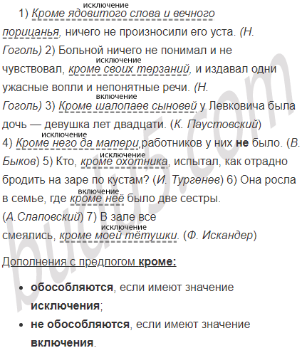 1) Кроме ядовитого слова и вечного порицанья ничего не произносили его уста. (Н. Гоголь) 2) Больной ничего не понимал и не чувствовал кроме своих терзаний и издавал одни ужасные вопли и непонятные речи. (Н. Гоголь) 3) Кроме шалопаев сыновей у Левковича была дочь — девушка лет двадцати. (К. Паустовский) 4) Кроме него да матери работников у них (не)было. (В. Быков) 5) Кто кроме охотника испытал, как отрадно бродить на заре по кустам? (И. Тургенев) 6) Она росла в семье, где кроме неё было две сестры. (А.Слаповский) 7) В зале все смеялись кроме моей тётушки. (Ф. Искандер)