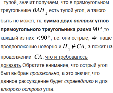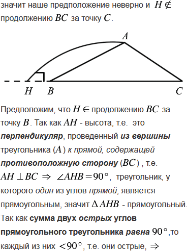 Докажите, что тупоугольном треугольнике основание высоты, проведённой из вершины тупого угла, лежит на стороне треугольника, а основания высот, проведённых из вершин острых углов, - на продолжениях сторон.