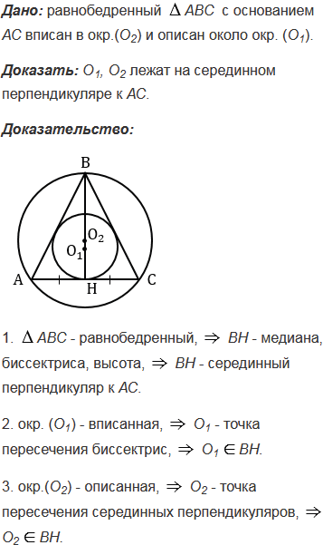 В равнобедренный треугольник вписана окружность с центром О1, и около него описана окружность с центром О2. Докажите, что О1 и О2 лежат на серединном перпендикуляре к основанию треугольника.