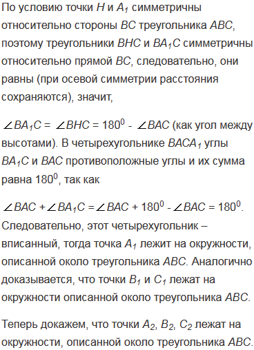 Пусть Н точка пересечения прямых, содержащих высоты треугольника АВС, А1, В1, С1 точки, симметричные точке Н относительно прямых ВС, СА, АВ, а А2, В2, С2 точки, симметричные точке Н относительно середин сторон ВС, СА, АВ. Докажите, что точки А1, В1, С1, А2, В2, С2 лежат на окружности, описанной около треугольника АВС.