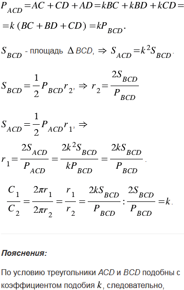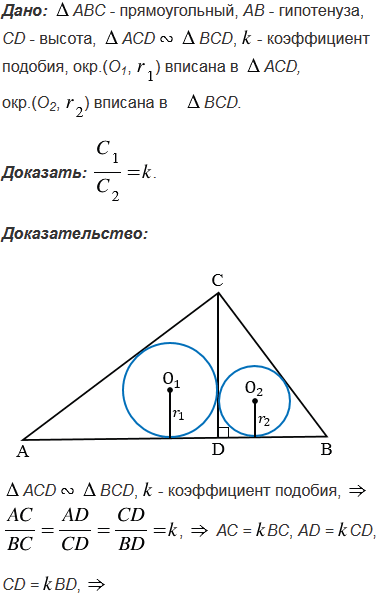 Высота прямоугольного треугольника, проведенная к гипотенузе, разделяет треугольник на два подобных треугольника (см. задачу, п. 71). Докажите, что отношение длин окружностей, вписанных в эти треугольники, равно коэффициенту подобия этих треугольников.
